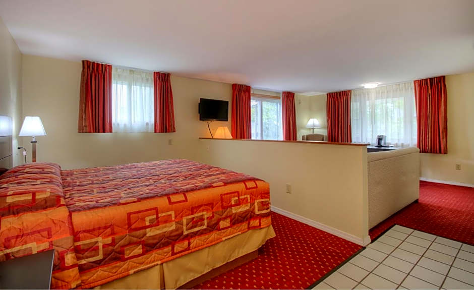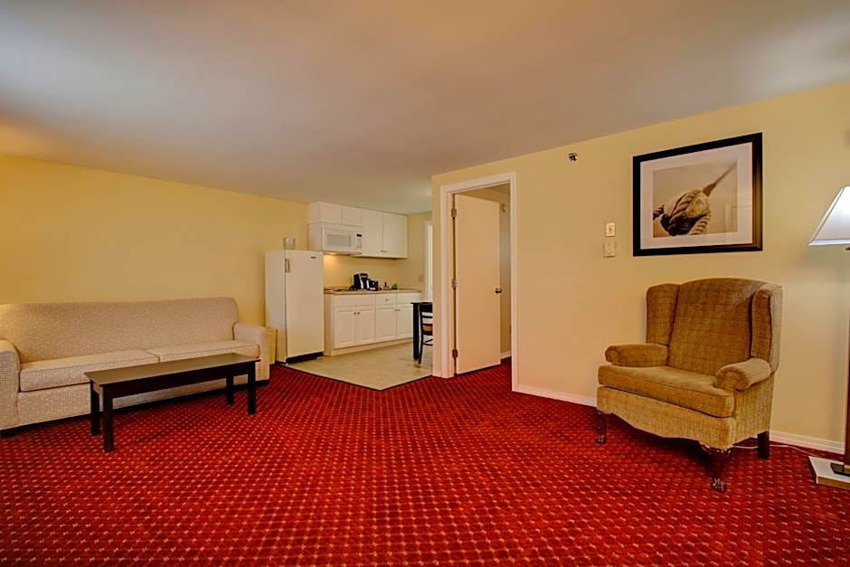 This suite has a king bed and a kitchenette. The kitchen has basic pots and pans and plates, glasses and cutlery. It has a coffee table and chairs for two. It also has an ironing board and an iron. The living room features a pull out couch. The bathroom has a spa bath. There is a deck where you can sit and relax with views of the tidal river and the ocean.