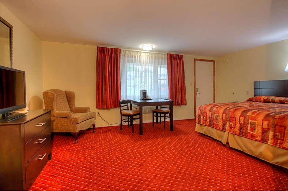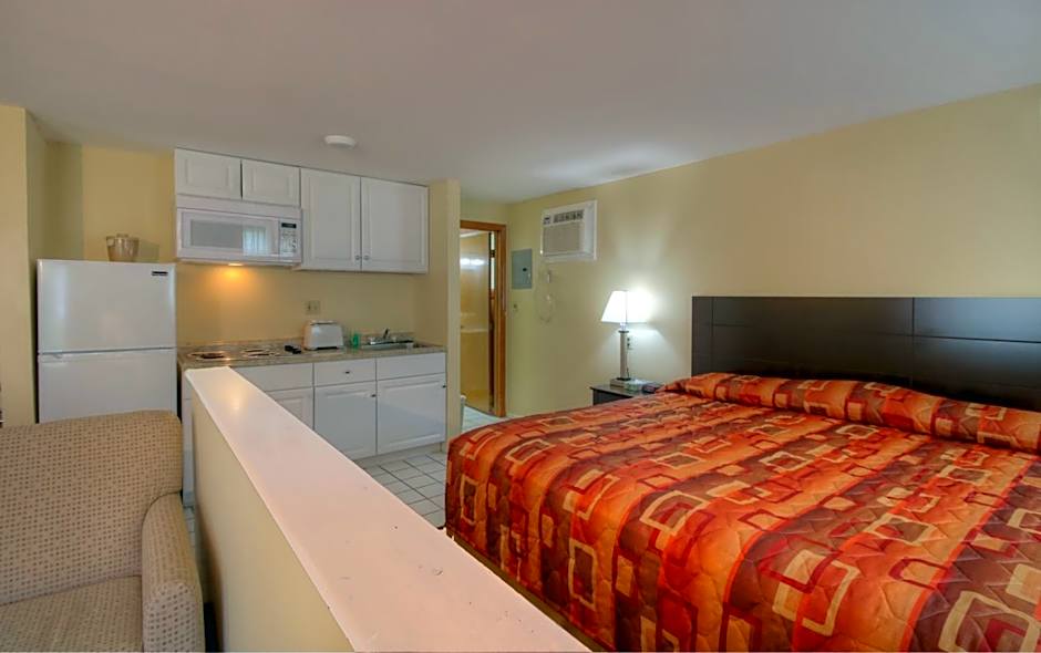 This room has a king bed and a kitchenette. It also has basic pots and pans and plates, glasses and cutlery. It has a table and chairs for two. It also has an ironing board and an iron.